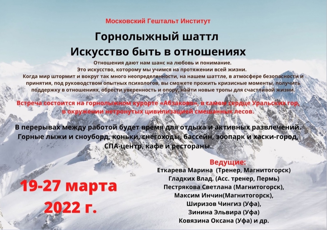 Весной 2024 года с 16 по 24 марта уже в шестой раз пройдет психотерапевтическое мероприятие Московского Гештальт Института Шаттл "Искусство быть в отношениях".