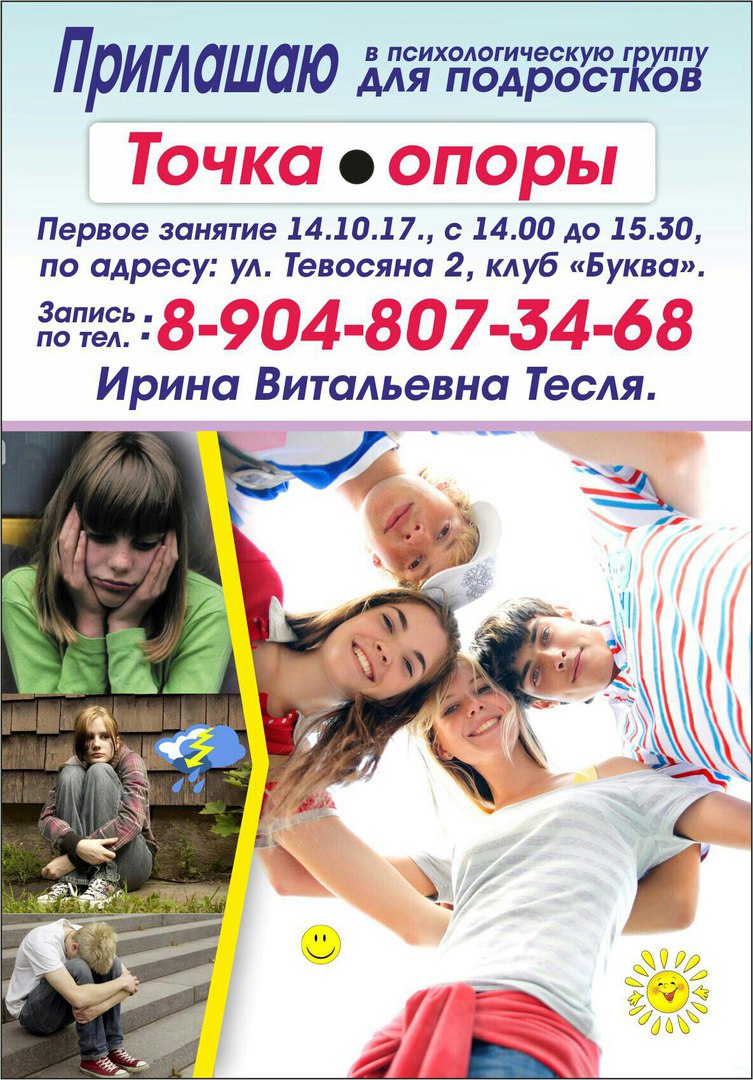 Работаем 2 раза в месяц, по средам, с 18 до 21ч по адресу: ул. Гагарина, 48-301.Ведущая: Еткарева Марина, тренер, супервизор.